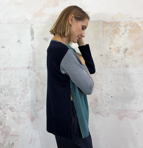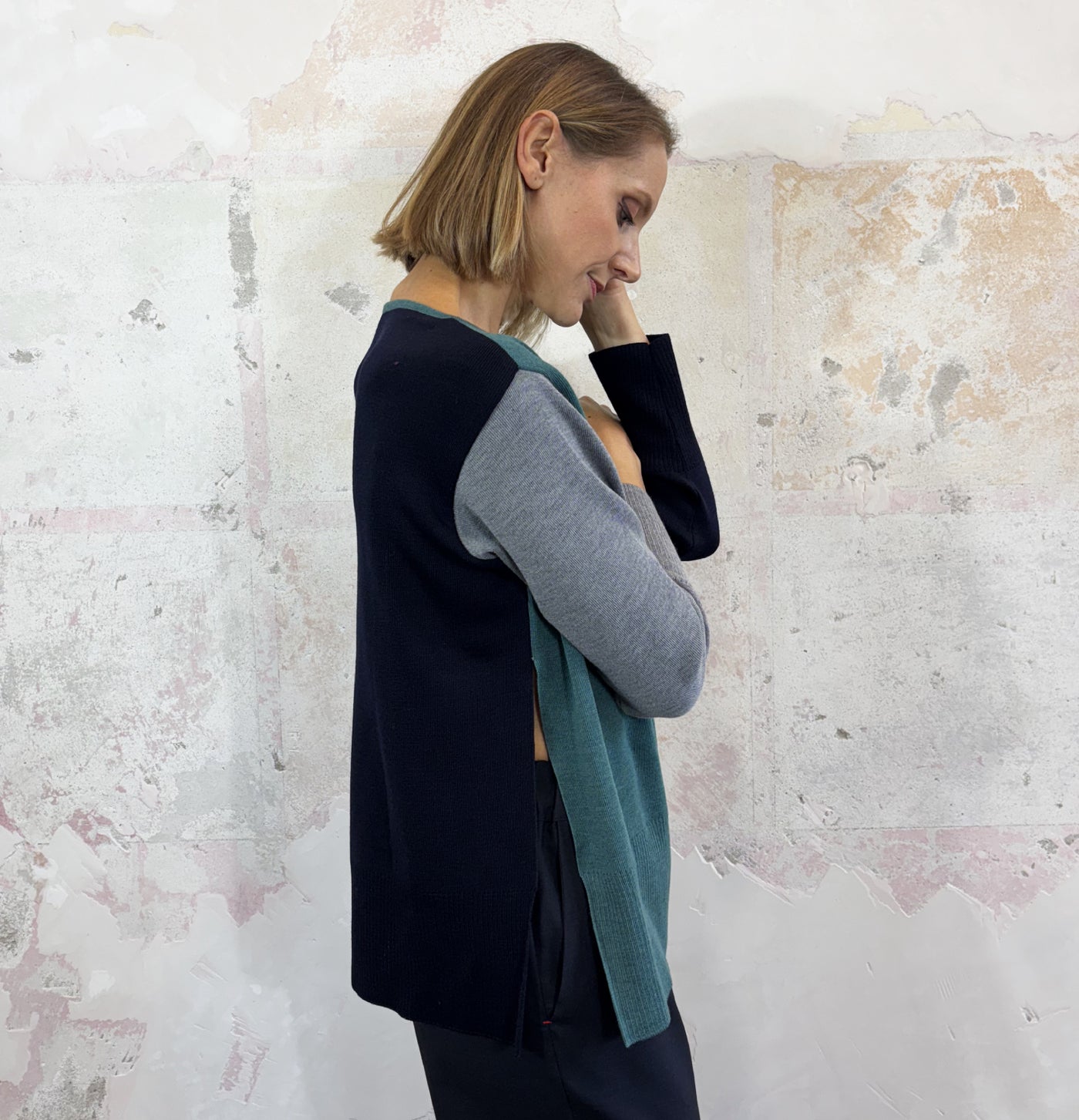 Scollo a barca, spacchi laterali profondi, 3 colori a contrasto ma sempre in armonia fra loro.